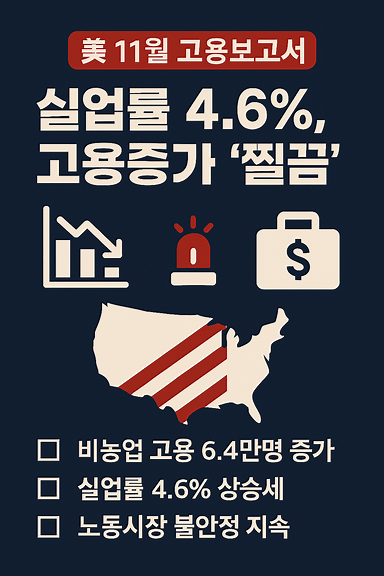 2025년 12월 16일(현지시간) 미국 노동통계국(BLS)은 11월 미국 고용보고서를 발표하였다. 고용지표는 겉으로는 ‘고용 증가’이나, 내용은 결코 안심하기 어려운 신호를 동시에 드러냈다. 미국 노동통계국(BLS) 자료를 인용한 보도에 따르면, 11월 비농업부문 고용(Nonfarm Payrolls)은 6만4천 명 증가하였다. 이는 같은 보도에서 언급된 바와 같이, 10월에 10만5천 명의 고용 감소가 기록된 이후의 반등으로 제시된다.그러나 고용이 늘었음에도 실업률은 11월 4.6%로 상승하였고, 해당 수치는 4년 만의 최고치로 보도되었다. 즉, “일자리가 늘었다”는 단일 문장만으로는 노동시장의 체감 온도를 설명하기 어렵고, 고용의 질과 구직·이직·비경제활동 인구의 변화가 함께 작동하고 있음을 시사한다는 점이 기사 맥락에서 확인된다. 이 같은 흐름은 금리·증시·환율 등 금융시장 해석에서 ‘고용의 방향’뿐 아니라 ‘실업률의 레벨’이 동시에 변수로 떠오를 수 있음을 의미한다.