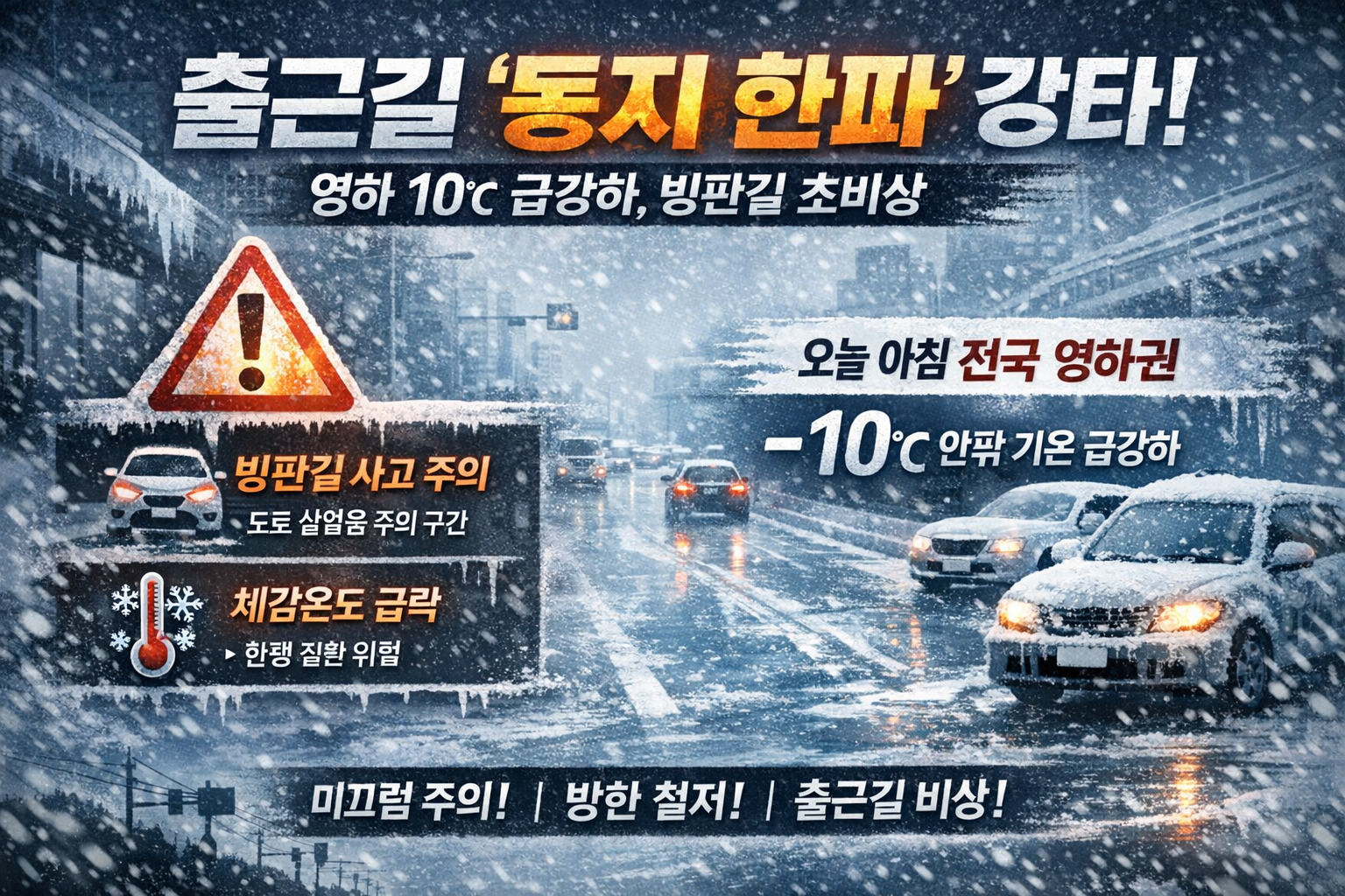 2025년 12월 22일 절기상 **동지(冬至)**를 맞은 대한민국은 전국적으로 강력한 한파가 출근길을 강타하고 있다. 기상청 발표에 따르면 22일 아침 기온은 전국 대부분 지역에서 영하권으로 급강하하며, 특히 내륙과 산지 일부 지역에서는 최저기온이 영하 10도 안팎까지 떨어질 것으로 예보됐다. 도시권에서도 서울·인천·수원 등 주요 출근길 지역이 영하 5도 안팎의 강추위에 직면하고 있으며 바람이 더해져 체감온도는 더욱 낮아질 것으로 예상된다.